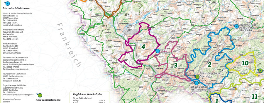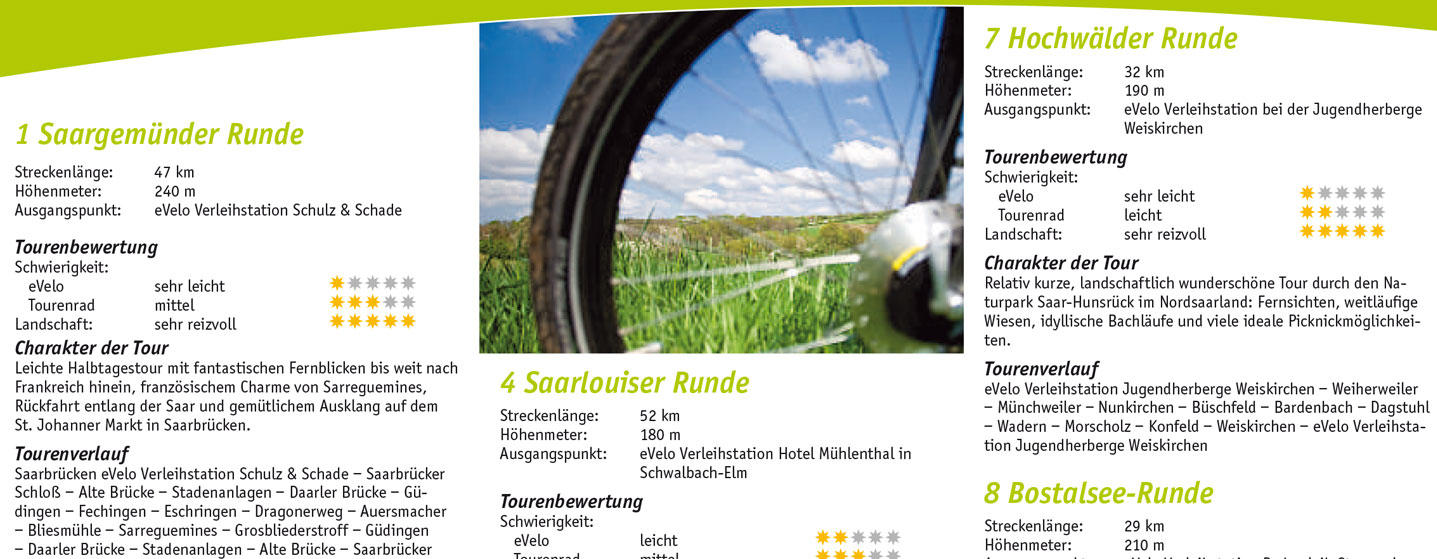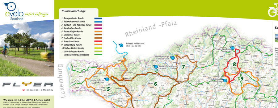 Zur Förderung der touristischen Nutzung von eBikes im Saarland wurde diese Faltkarte mit speziell angepaßten Tourenbeschreibungen entwickelt. Die abgebildeten Touren wurden unter Nutzung des bestehenden gut ausgebauten touristischen Radwegenetzes von eBike Verleihstationen aus geplant. Die Streckenführungen und -längen wurden so an die bestehenden Akkwechsel- und Ladestationen angepasst. Die Nutzer müssen so nicht befürchten, wegen erschöpfter Akkukapazitäten unterwegs ohne Motorunterstützung fahren zu müssen.