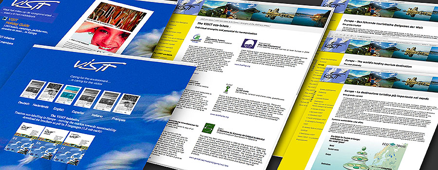 Die Broschüre mit den Ergebnissen des europäischen VISIT-Projektes wurde in 3 Sprachen publiziert. Zur Senkung der Druckkosten entwickelte amides ein flexibles Layout (bestehend aus den Abbildungen, Infografiken und Tabellen), in das die Texte in einer deutschen, englischen und italienischen Version eingedruckt werden konnten. Das Team aus Gestalter, Autoren, und Übersetzern löste die Aufgabe, die Texte der einzelnen Sprachvarianten in ungefähr gleicher Länge zu produzieren und so in allen Sprachen eine gut lesbare, attraktive Broschüre zu produzieren. Mit Abschluß des Projektes wurde die Broschüre auch als online-Version aufbereitet.
