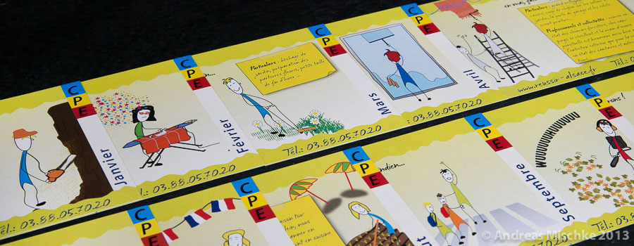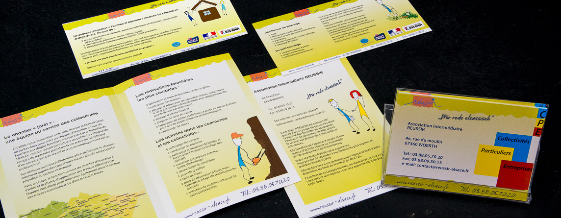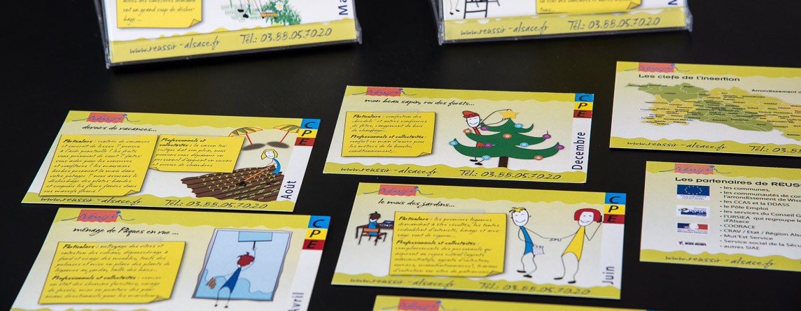Der Verein Réussir ist eine Initiative zur Wiedereingliederung (Langzeit-)Arbeitsloser in den Arbeitsmarkt. Ein Problem in der Darstellung der Tätigkeitsfelder ist das normalerweise eher trocken-administrativen Informationsmaterial. Zur animativeren Darstellung der Tätigkeitsfelder entwickelte Amides einen Satz an öffentlichkeitswirksamen Material, das mit illustrativen Charakteren den Zugang zu den Thematiken erleichtert.